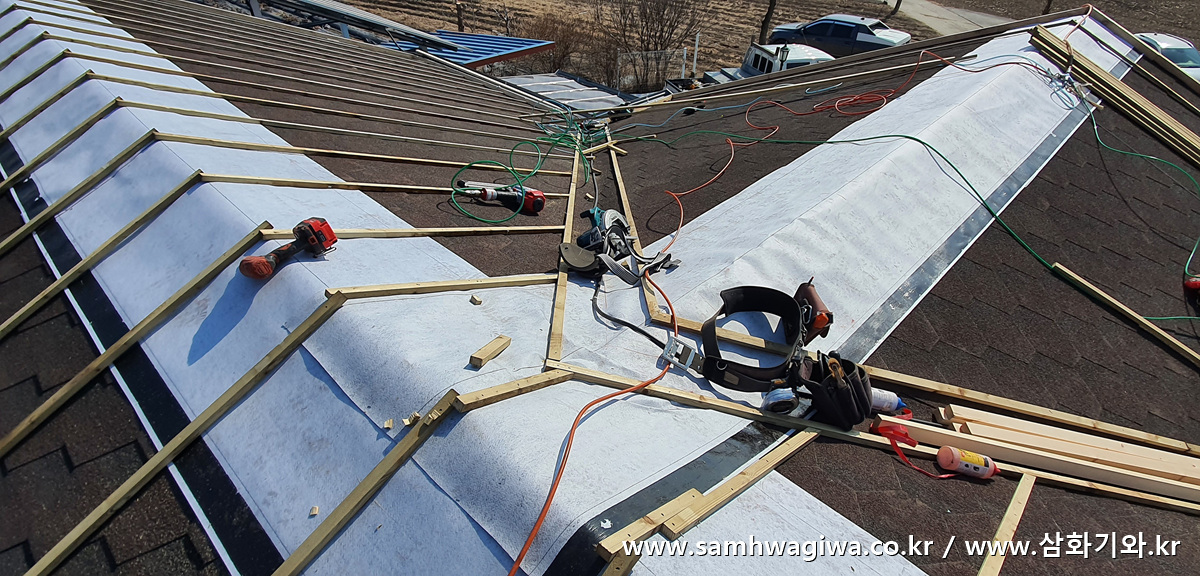 가로상 작업이 끝나고 기와골에는 밸리 후레싱까지 부착이 끝났습니다. 기존의 굵은 태양광 전기 인입선은 바로 이 후레싱 밑으로 숨겨 놓은 상태입니다.