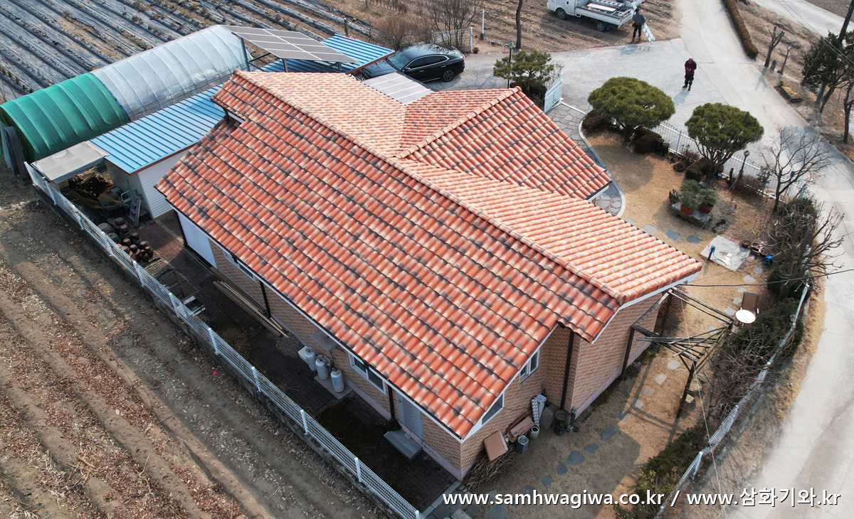 새롭게 변모한 주택의 모습을 사방에서 담아 보았습니다. 기와가 바뀌니 마치 전혀 다른 느낌의 새로운 집으로 느껴집니다. 외벽의 색상과도 무척이나 잘 어울리네요. 이제 드론 촬영으로 하늘에서도 감상해 볼까요.
