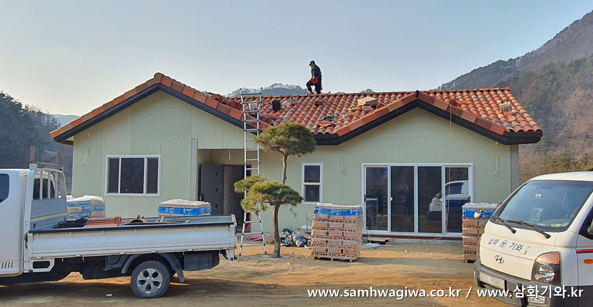 지상에서 바라본 모습입니다. 샌드위치 패널만 덮여 황량하고 썰렁했던 지붕이 기와를 덮으니 아주 근사하게 변모했네요. 이제 외벽 마감만 진행하면 더욱 예쁘게 변모할 것으로 기대합니다.