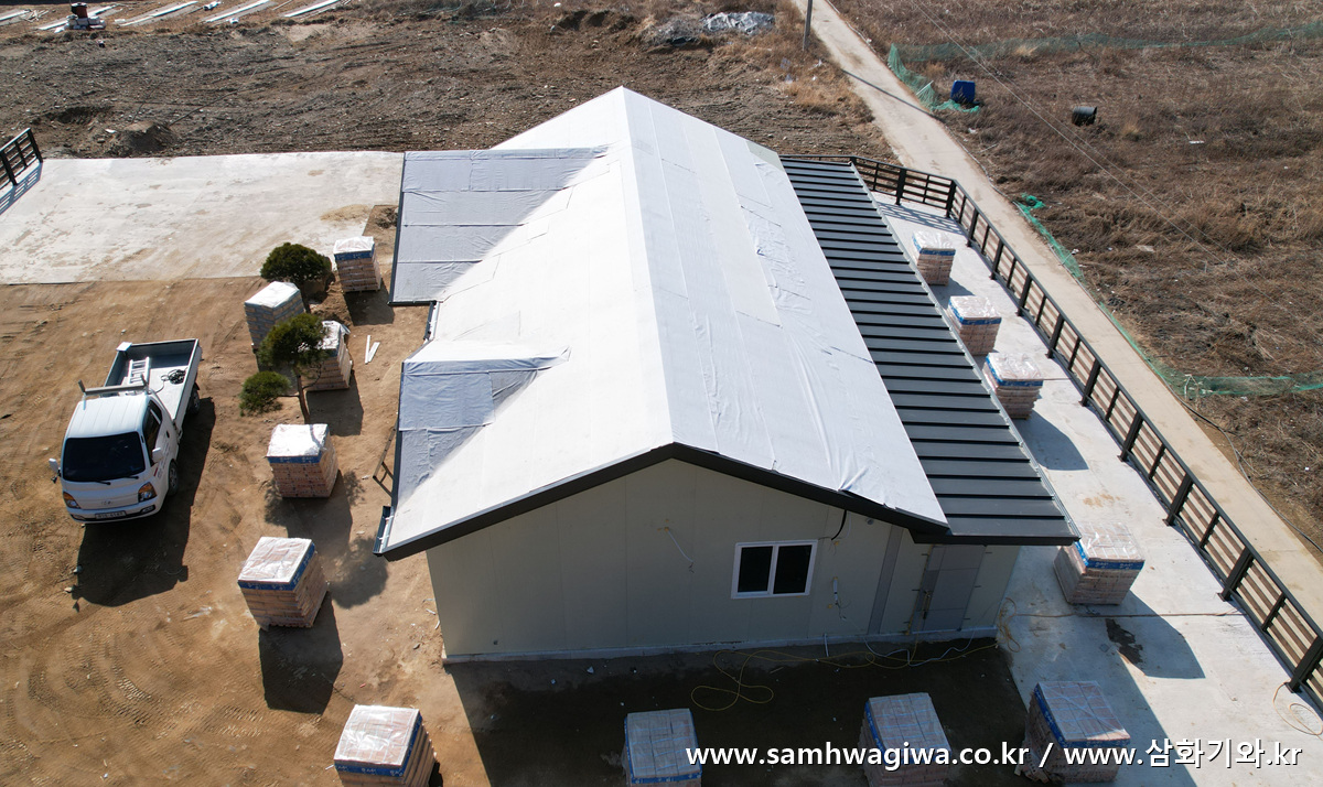 그런데 중앙 지붕 처마쪽의 후레싱 마감이 이루어지지 않은 상태라 샌드위치 패널 절단면의 스티로폼이 그대로 노출되어 있는 것이 보이네요. 이 부분은 기와 시공을 하면서 후레싱으로 감싸줄 예정입니다.