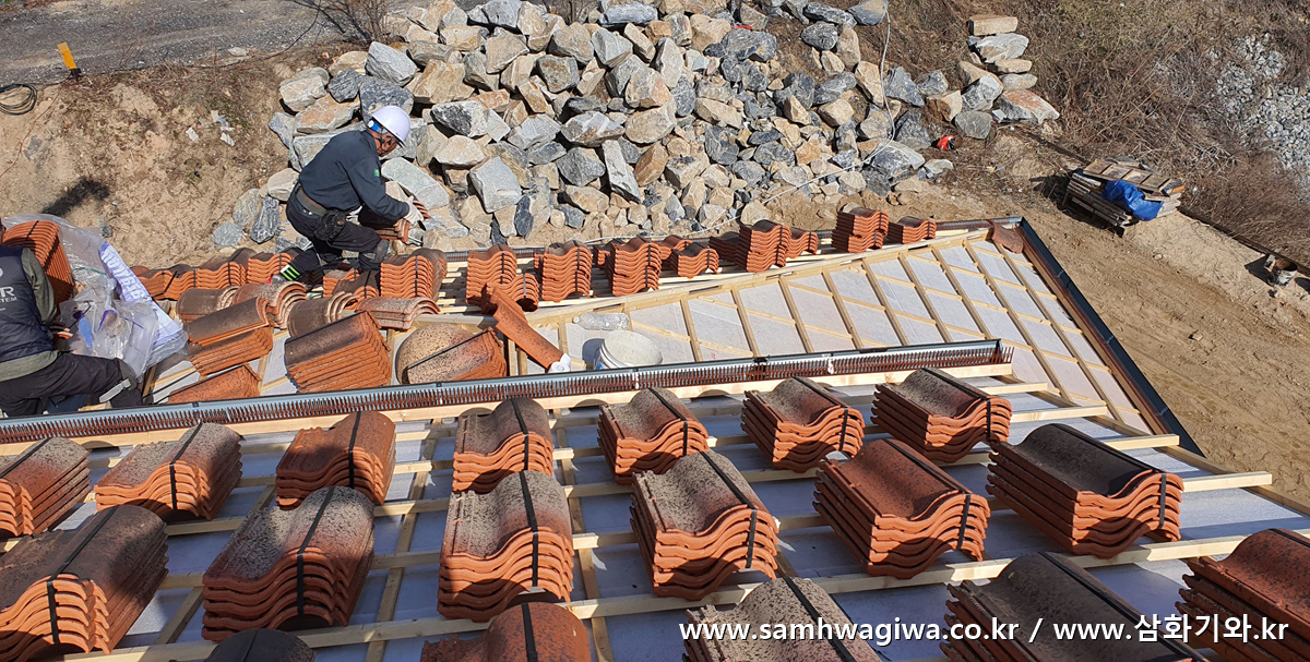 본격적인 기와 시공에 들어갑니다. 지붕 면도 많고 자르거나 가공할 기와가 많아서 시간이 많이 소요됩니다.