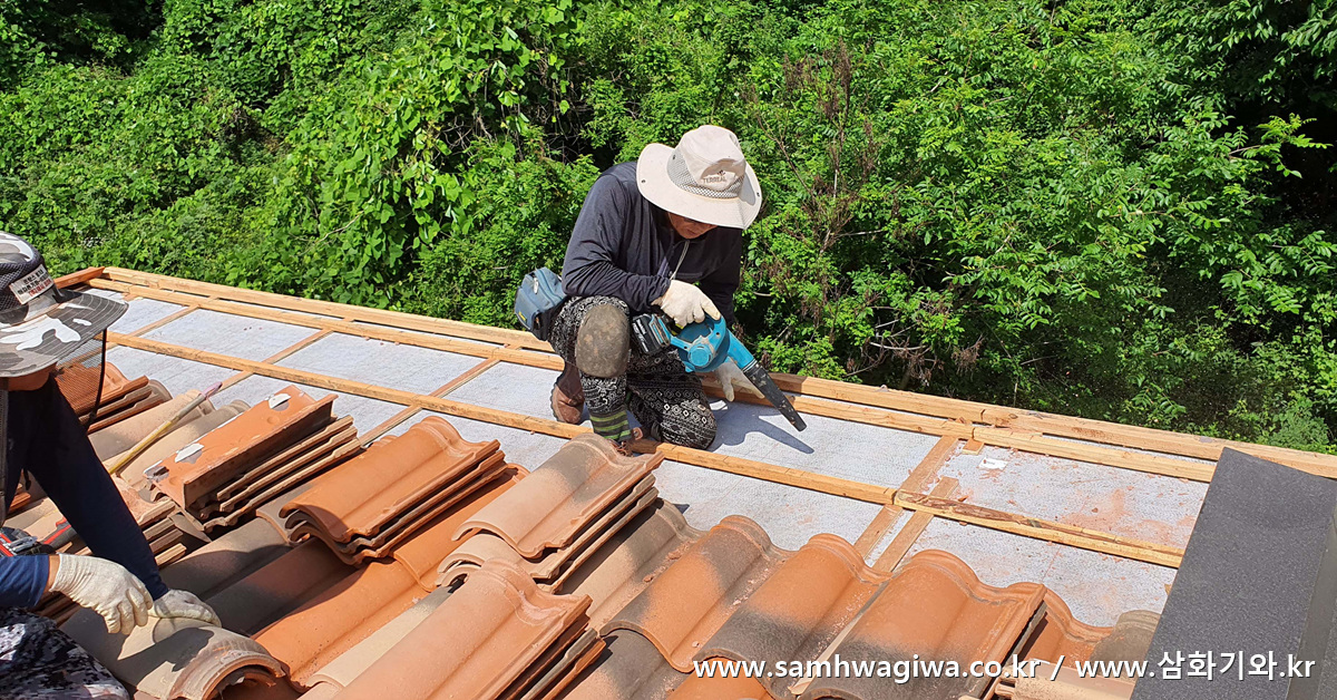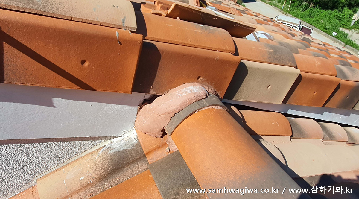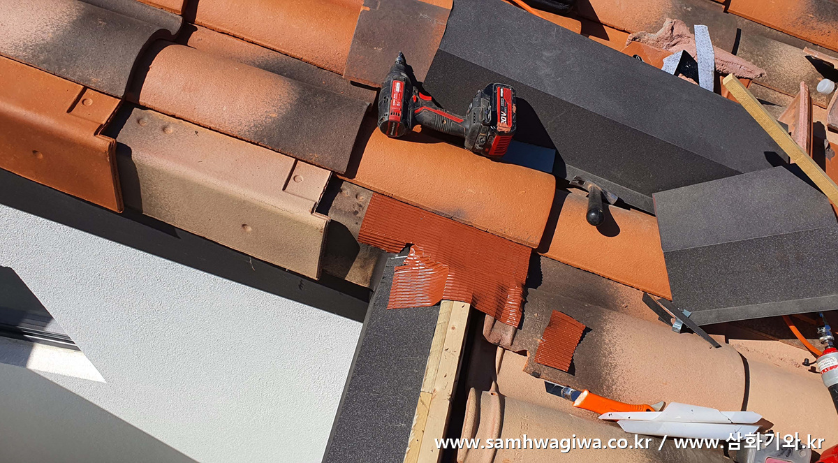 잘려 있는 갓기와를 철거한 후에 새로 갓기와를 재단하여 교체한 모습입니다. 이렇게 교체한 후에 아래쪽에 있는 바닥 기와와 알루미늄 벤트로 연결해 주면 위쪽에서 흐르는 빗물이 자연스럽게 아랫쪽으로 흐르게 됩니다.