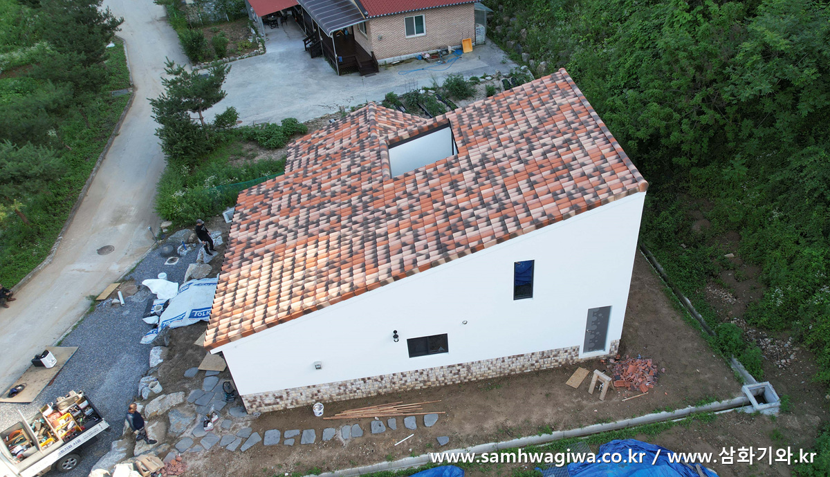 이번 현장은 제천시 봉양읍에 위치한 개인주택 지붕 보수 현장입니다. 목조로 골조와 지붕을 구성한 목조주택으로서 지붕의 모양은 외쪽지붕과 맞배지붕이 혼합된 형태입니다. 몇 개월 전에 외지의 타 업체에서 수입 점토기와로 시공했다고 하는데 부실 시공으로 인해 빗물 누수 문제가 발생했다고 하네요. 시공했던 업체는 연락을 받지 않는 상태라 저희 쪽으로 보수 요청이 와서 수리를 진행하게 된 현장입니다.