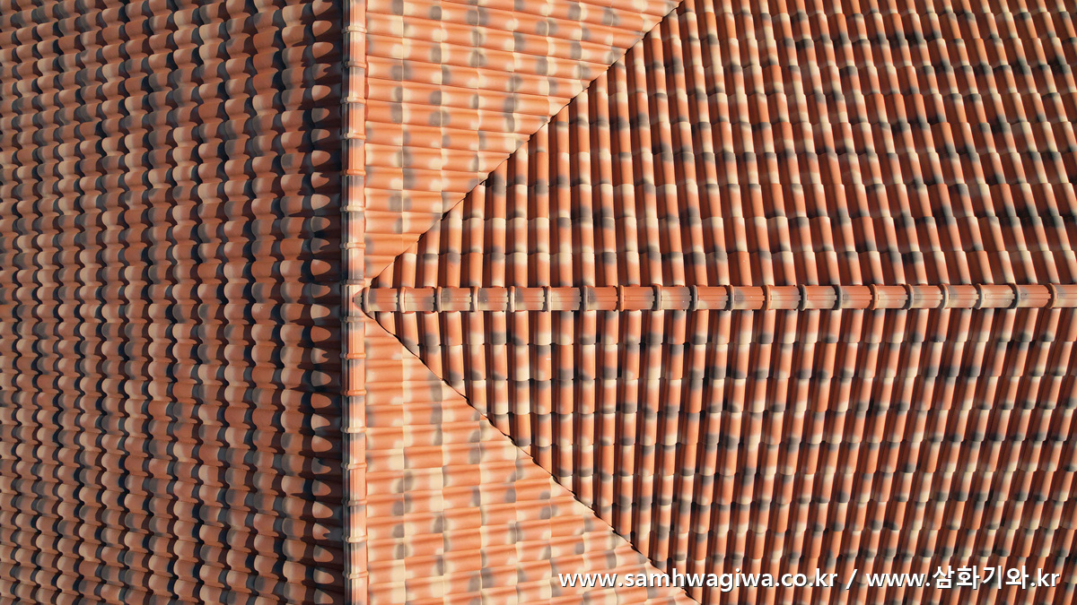 하늘 위에서 여러 각도로 바라본 지붕의 모습도 아주 근사합니다. 이번에 사용된 기와는 마자론 기와의 쏘렌토(Sorrento)라는 모델입니다. 붉은 색과 황토색을 베이스로 하고 중간중간 크림색과 회색으로 포인트를 준 변색 기와로서 따뜻하면서도 화려한 느낌이 특징인 고급 기와입니다.