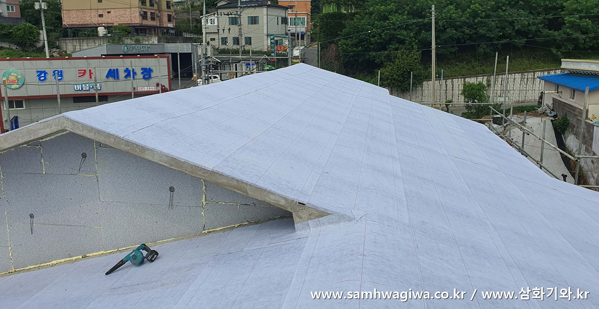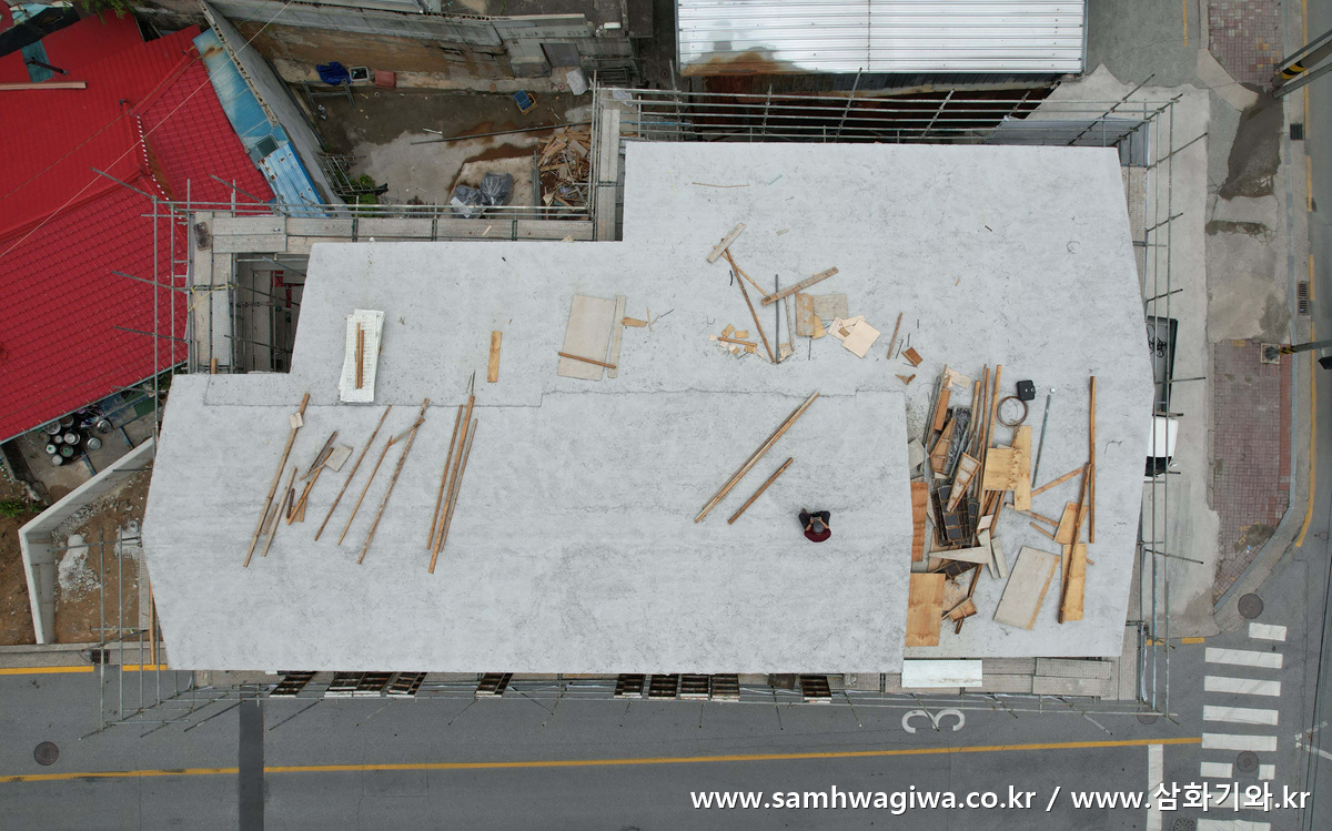 며칠의 시간이 지난 후 본격적인 기와 시공에 앞서 지붕면에 방수 시트만 먼저 부착하기 위해 현장을 다시 찾았습니다. 지붕면 위에 크랙이 생긴 부분에는 검은 콜타르 방수액을 발라 놓은 것이 보입니다. 방수 시트가 잘 붙도록 지붕면 위에 쌓인 먼지와 폐자재 등을 깨끗하게 청소하고 있는 모습이네요. 외벽에 단열재를 접착해 놓은 것도 보입니다.
