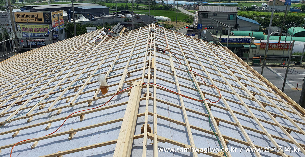 방수 시트 접착이 모두 끝났습니다. 이제 잠시 철수했다가 외벽 벽돌 마감이 끝나면 다시 본격적인 기와 시공을 시작할 예정입니다.