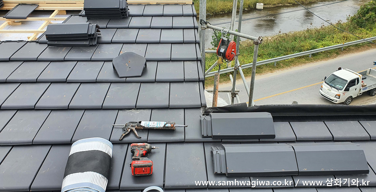 차근차근 바닥 기와를 덮어 나갑니다. 어느덧 용마루 부근까지 작업이 진행되었네요. 용마루 바단부를 벤트로 감싸는 작업을 하고 있습니다.