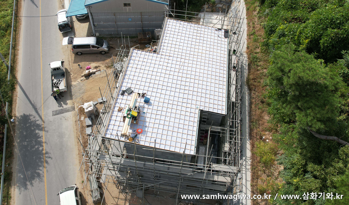 외쪽지붕 용마루에도 전용 후레싱을 씌워 놓은 것이 보이네요. 이제 기와 인양을 할 준비가 끝났습니다.