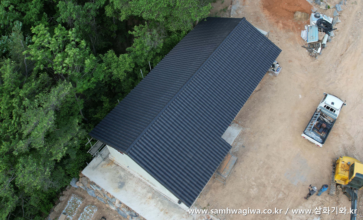 하늘 위에서 바라본 지붕의 모습이 근사합니다. 아직 완성되지 않은 집인데도 무광 블랙의 기와 색상 때문인지 중후하고 깊이 있는 느낌을 주네요. 외부와 내부가 모두 마무리되면 어떤 모습으로 변신할지 기대가 됩니다. 마자론 블랙 색상 기와에 대한 안내는 아래 링크를 참조하세요.