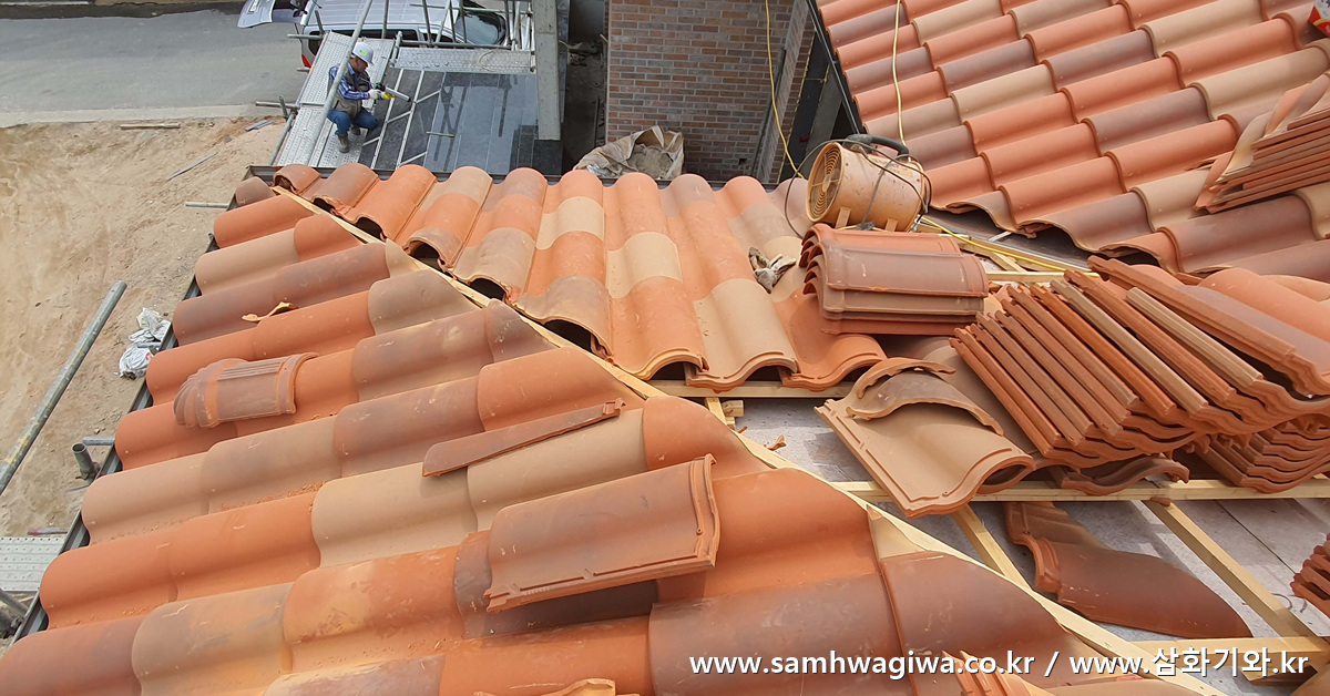인양이 끝나고 본격적으로 기와 시공이 시작됩니다. 이번에 사용되는 기와는 마자론 사의 코르텐 (Corten) 기와입니다. 붉은색과 황토색 위주로 배합된 변색 기와로서 따뜻한 느낌을 주는 마자론 사의 베스트셀러 중 하나입니다.