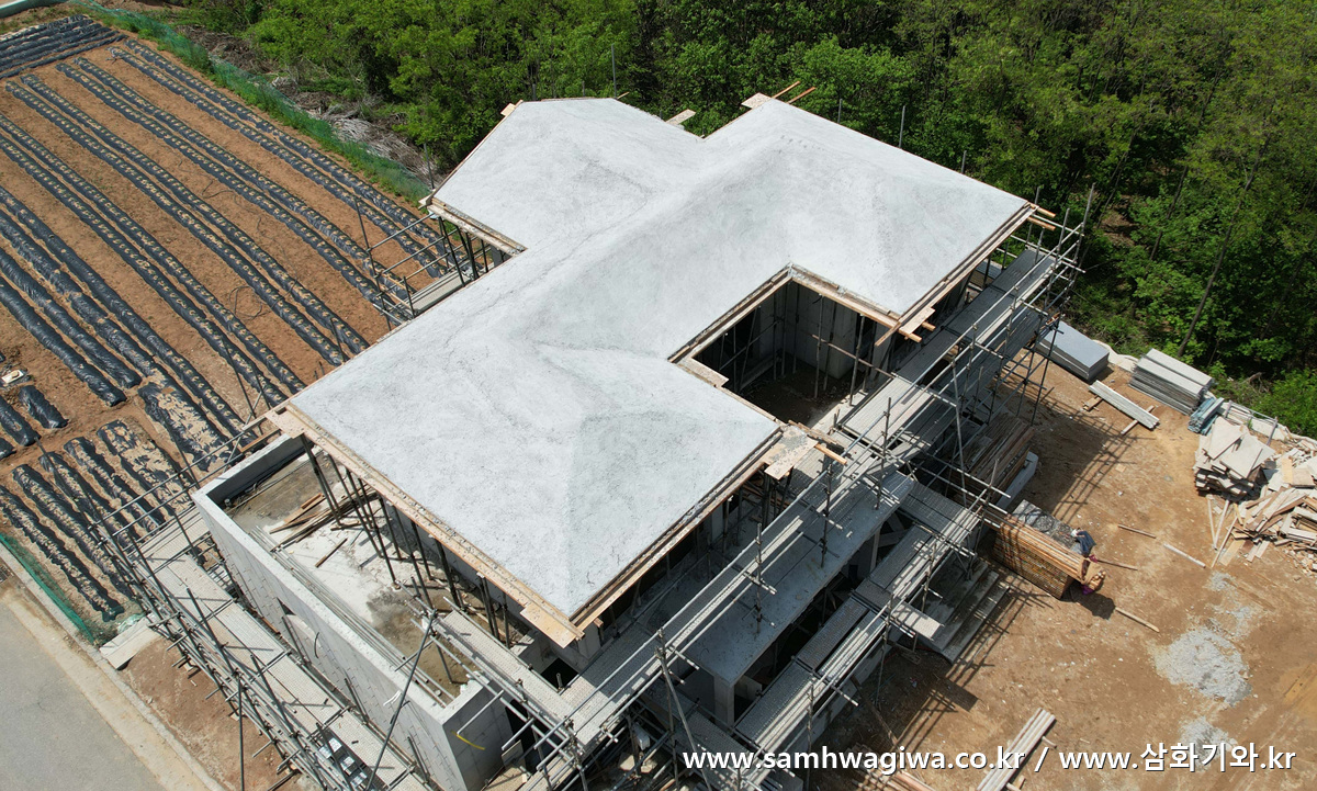 이번 현장은 제천시 강제동에 위치한 개인 주택 신축 현장입니다. 철근 콘크리트 구조의 2층 건물로서 지붕 모양은 마치 한자(漢字)의 철(凸)자 모양과 비슷하게 생긴 독특한 형태의 주택입니다.
