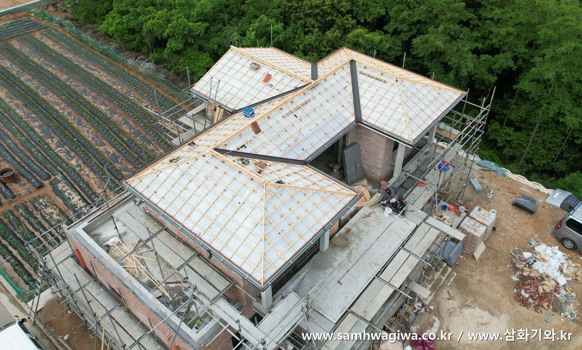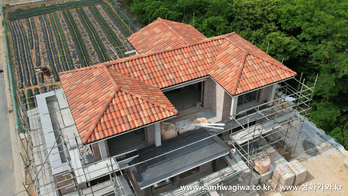 이번에 사용된 기와는 마자론 기와의 코르텐(Corten)이라는 모델입니다. 붉은 색과 황토색 위주로 구성한 변색 기와로서 따뜻하면서도 화려한 느낌이 특징인 고급 기와입니다. 완성 후의 항공촬영 동영상도 감상해 보세요. 사진은 한 장처럼 보이지만 들어가 보시면 각각의 상황에 따라 볼 수 있도록 팝업 메뉴로 링크를 구분해 놓았습니다. 각도를 달리해서 촬영한 총 여덟 장의 VR 사진을 감상하실 수 있습니다.