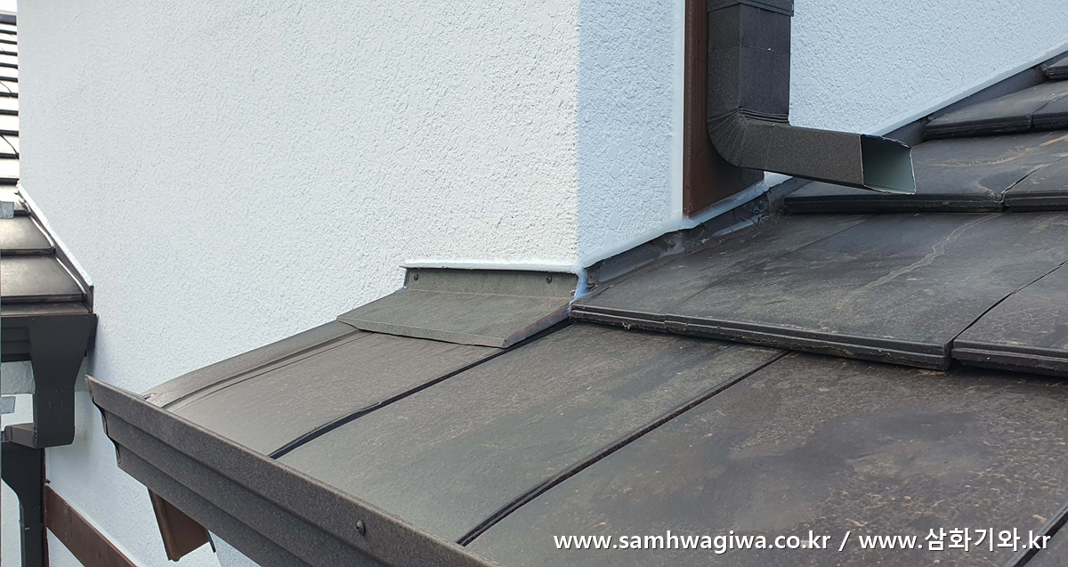 문제가 되었던 엘리베이터실 벽면의 기와골 처리 부분입니다. 기와골을 따라 흘러내린 빗물이 엘리베이터실 외벽면을 감싼 후레싱과 만나 합류하면서 배수되는 구조입니다. 배수가 끝나는 지점의 빗물받이 거터가 너무 짧기 때문에 혹시라도 폭우가 내릴 경우에는 자칫 빗물이 흘러 넘치는 경우가 생길까 걱정되지만 지붕의 설계 자체가 이렇게 되어 있기 때문에 별다른 방법이 없습니다. 지붕 시공을 하다 보면 외양에는 신경을 많이 쓰면서 가장 중요한 배수에 관해서는 깊은 고민을 하지 않는 건축설계사가 의외로 많다는 것을 자주 경험하게 됩니다. 빗물 배수에 대해 좀 더 풍부한 경험과 이해도가 높은 설계사가 많아졌으면 하는 바람입니다.