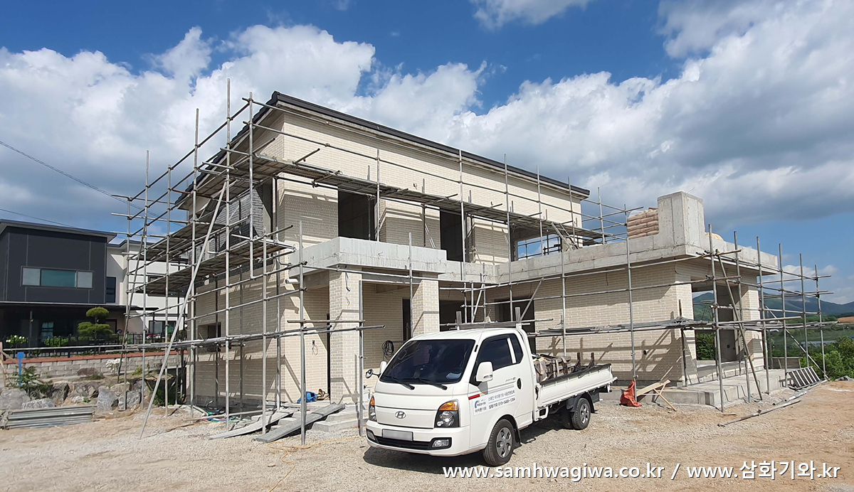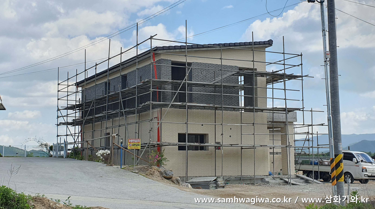 이번 현장은 제천시 두학동에 위치한 개인주택 신축 현장입니다. 철근 콘크리트 골조의 2층 건물로서 지붕의 모양은 경사면이 한쪽으로만 향해 있는 외쪽지붕 형태입니다.