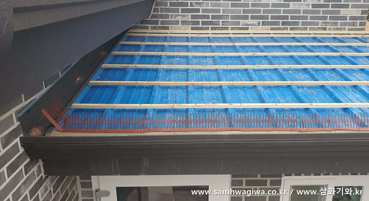 그 이유는 바로 세로상 대신에 위와 같은 골강판을 설치하기 때문입니다. 골강판이란 요철이 있도록 만든 칼라 강판을 말하는데요, 이렇게 골강판을 깔고 그 끝단을 물받이 위로 걸치게끔 설치하면 설사 빗물이 기와 밑으로 역류하더라도 바로 밑의 골강판을 타고 물받이로 흐르기 때문에 누수에 안전하게 됩니다.