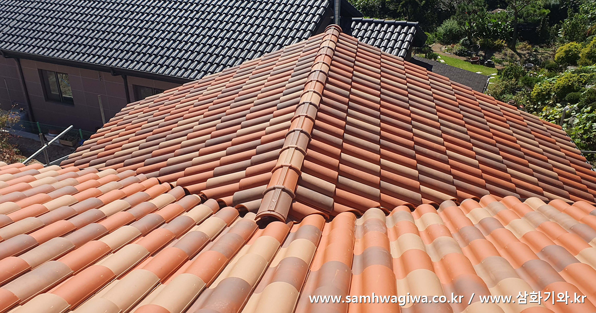 이번에 사용된 기와는 마자론 기와의 쏘렌토(Sorrento)라는 모델로서 붉은 색과 황토색을 베이스로 중간중간 따뜻한 느낌의 크림색으로 포인트를 준 변색 기와입니다.