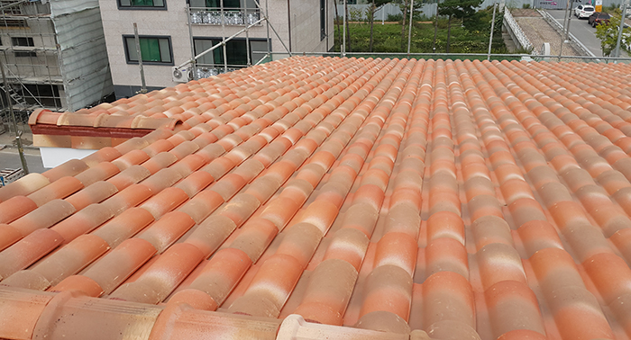 변색기와 특유의 화려함을 의도적으로 배제하고 전체적으로 붉은 톤의 색상 위주로 배색하여 따뜻하고 고즈넉한 분위기를 강조한 기와입니다. 마치 석양의 붉은 태양이 연출하는 노을을 떠올리게 만드는 아름다운 기와로 지중해의 정취를 느껴보세요.